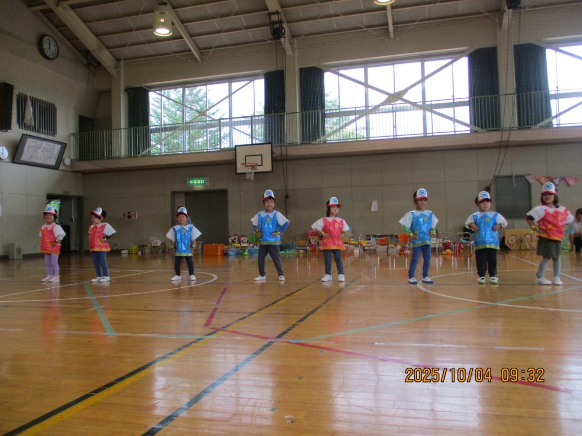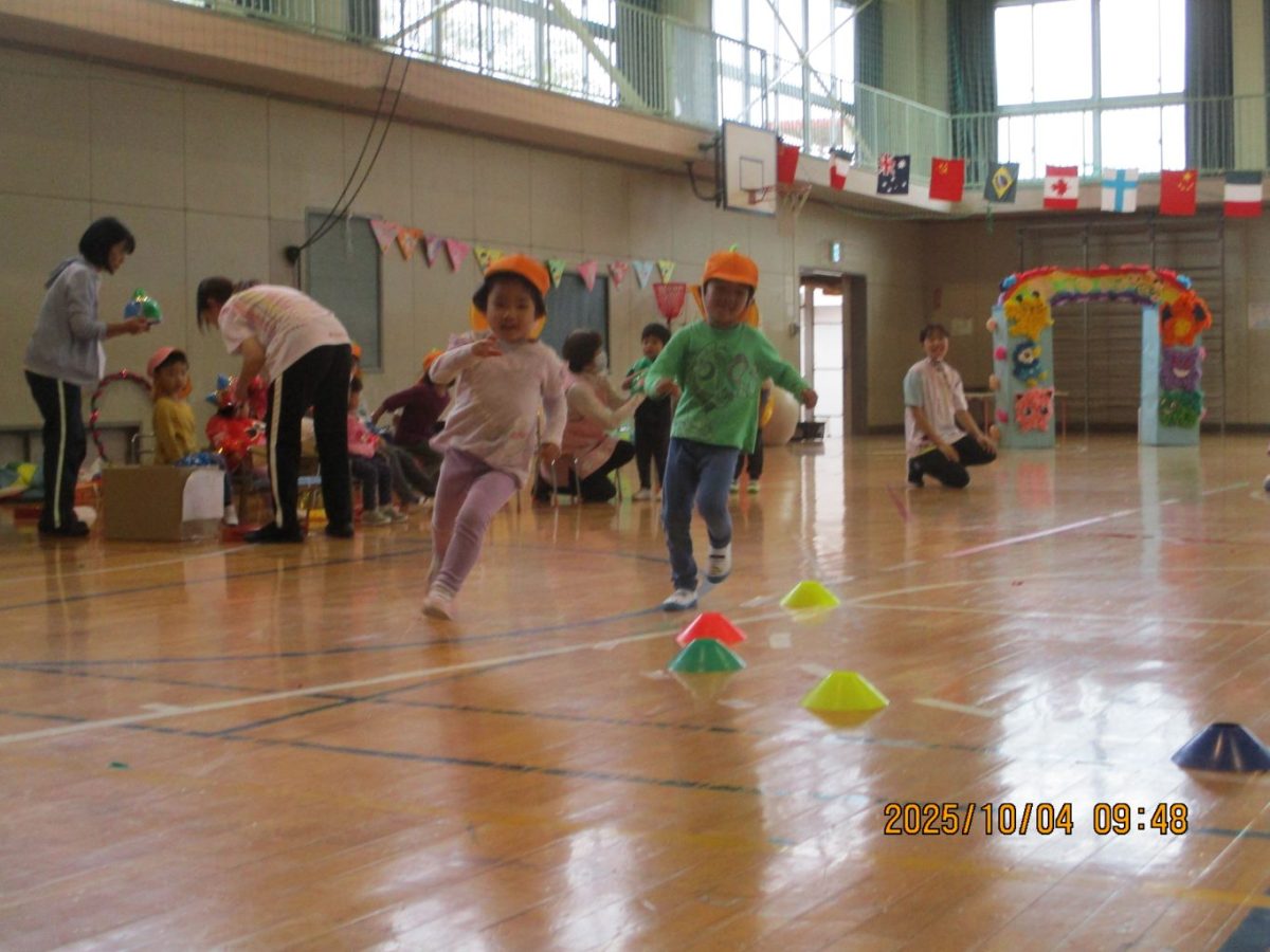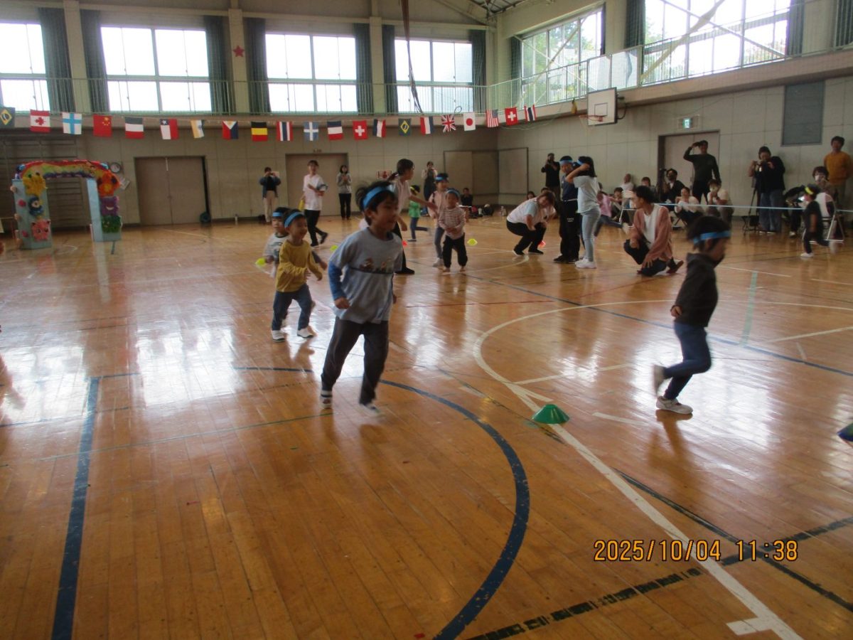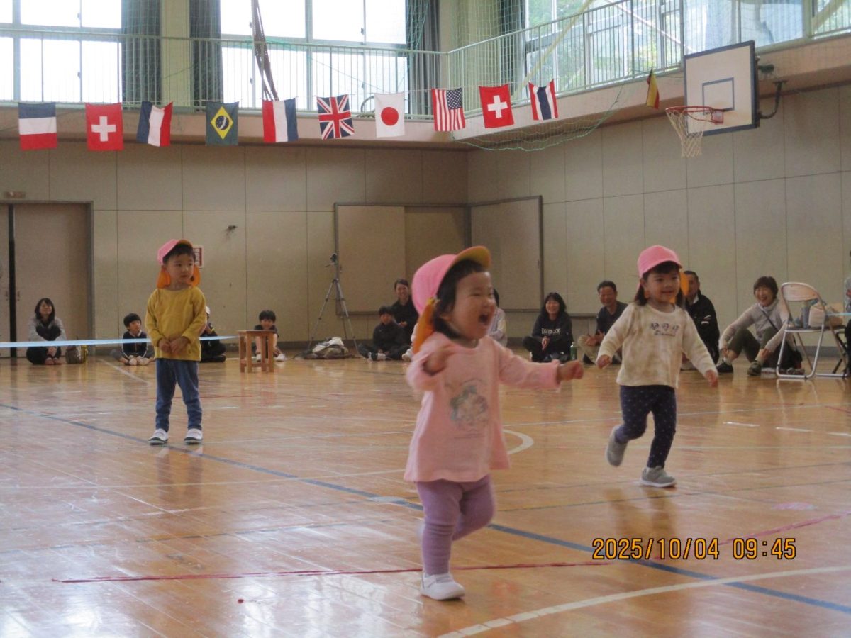 4日に運動会を行いました。今年は早朝に雨が降ったので園庭ではなく体育館で行うことにしました。