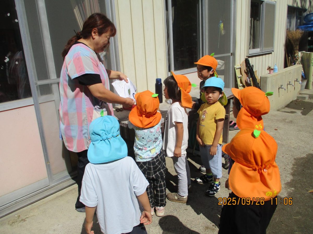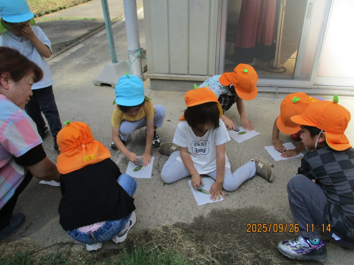 保育士の話に興味津々な子ども達。それぞれ布をもらい、好きな葉っぱを取ってから各自行いました。