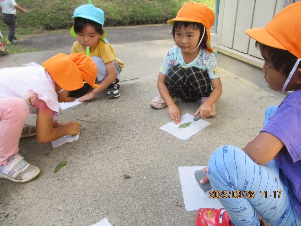 葉っぱの色が布につくように何度も石で叩きました。「これで良いのかな?」「先生、これであってる?」と友だちや保育士と話しながら集中して行いました。